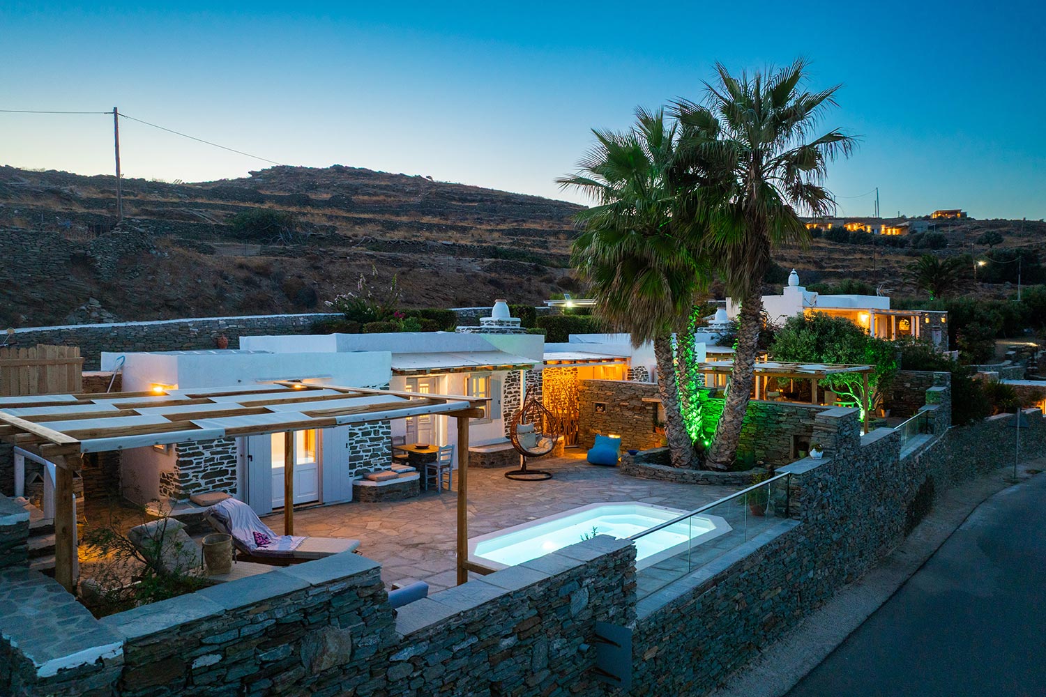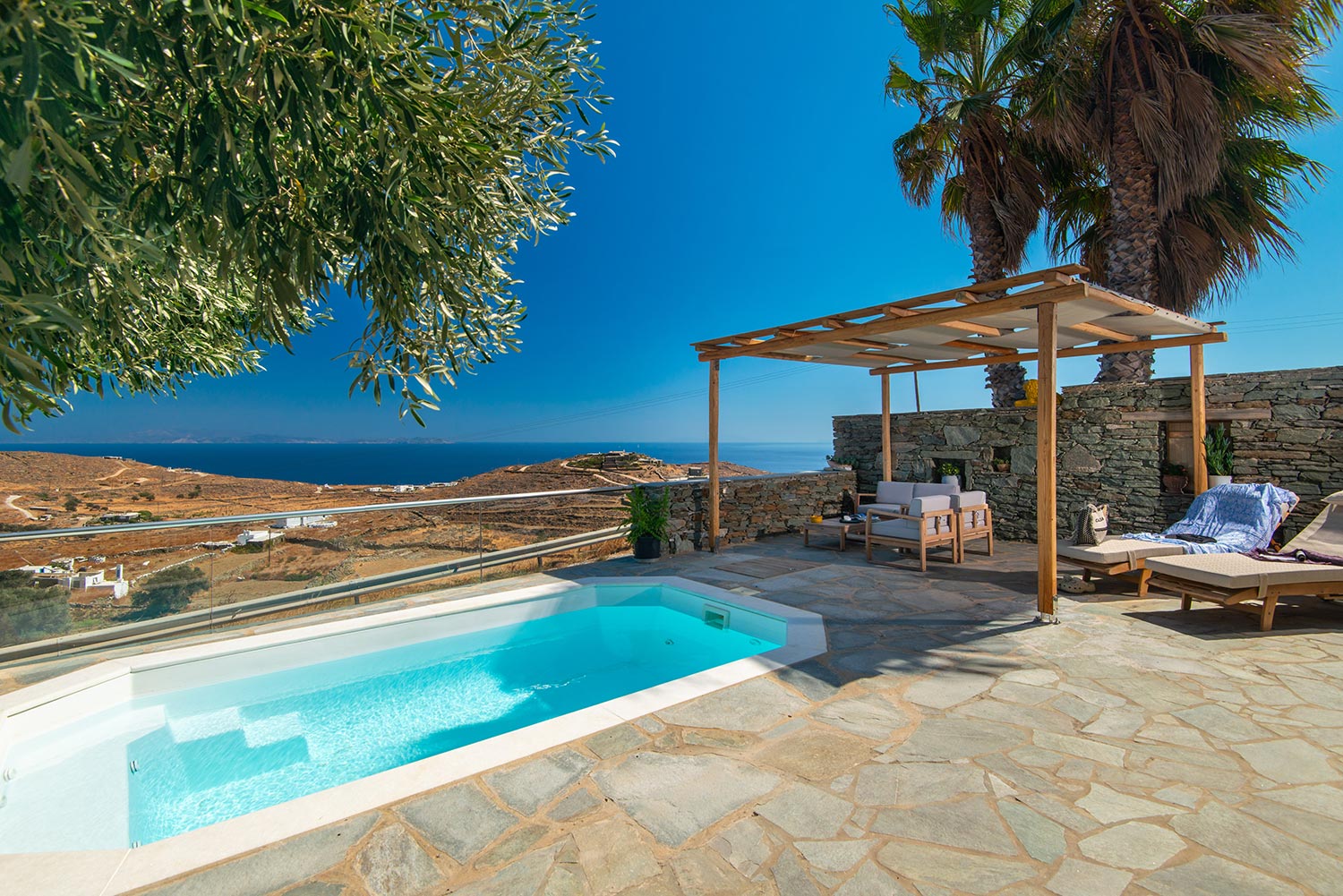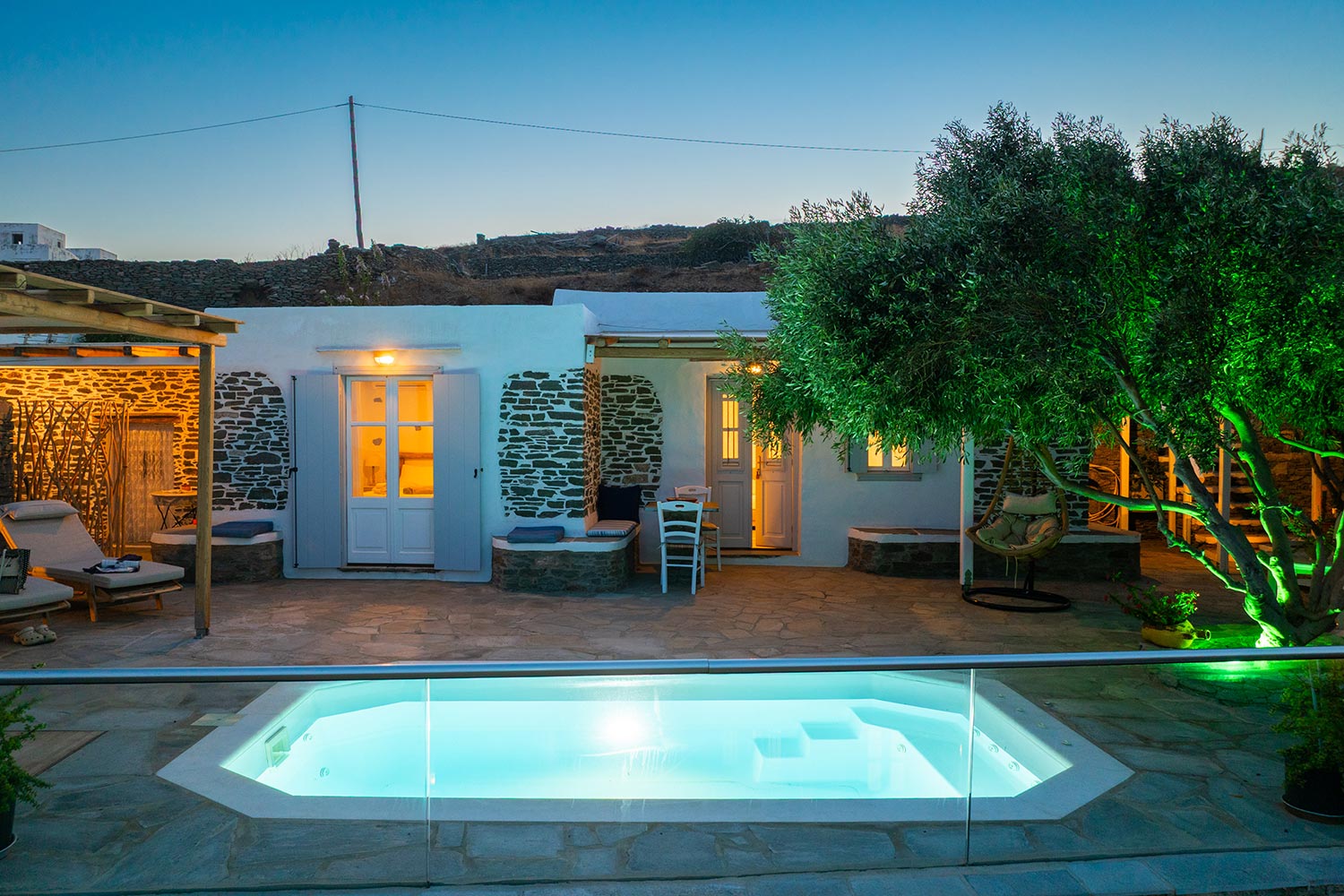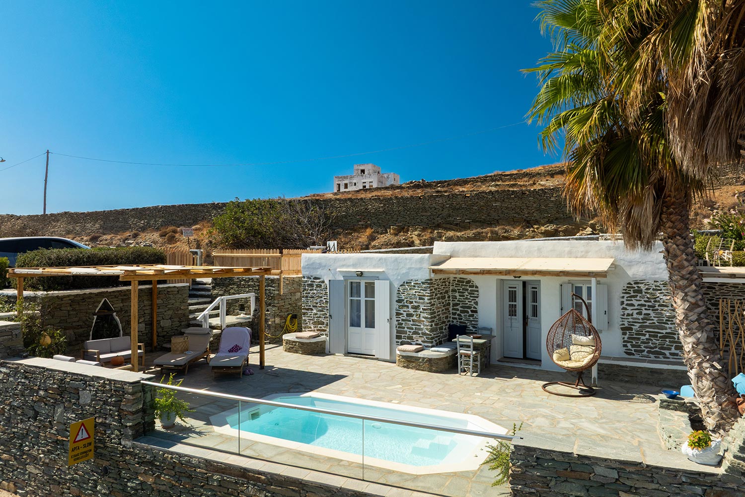 Μια υπέροχη ευρύχωρη αυλή με μικρό καθιστικό και ιδιωτική πισίνα βρίσκεται μπροστά από κάθε διαμέρισμα, διαχωρισμένη από το διπλανό ώστε να εξασφαλίζεται η ιδιωτικότητα των φιλοξενούμενων. Η θέα είναι πραγματικά υπέροχη καθώς μπροστά απλώνεται η περιοχή του Φάρου με τις ξερολιθιές και τα ελαιόδεντρα και το καταγάλανο Αιγαίο.