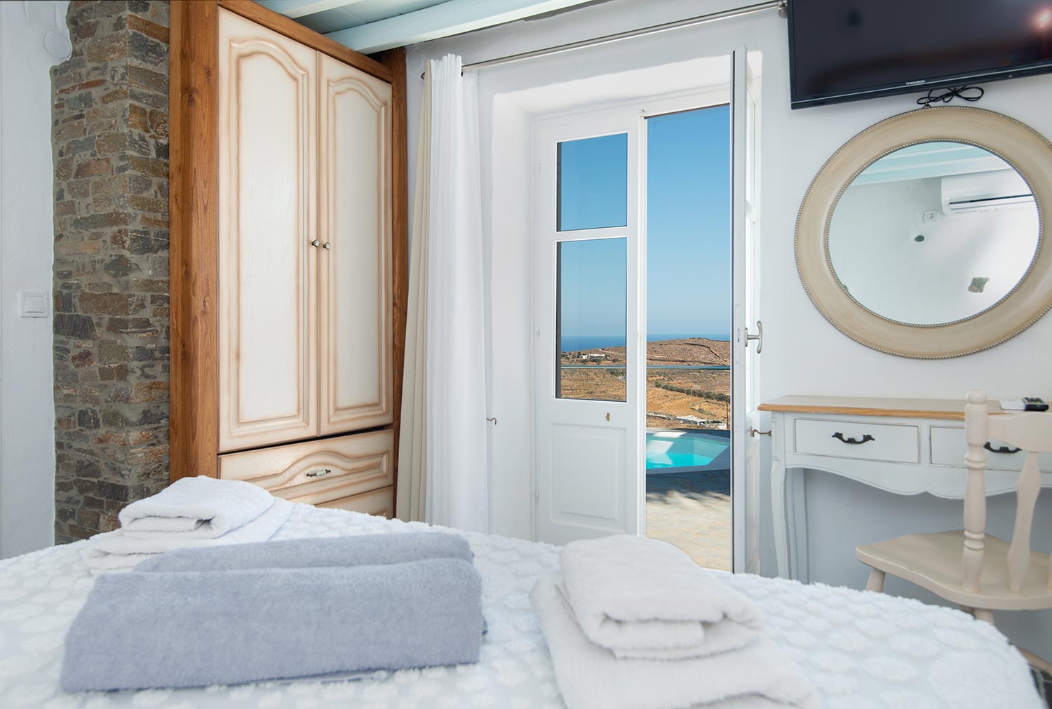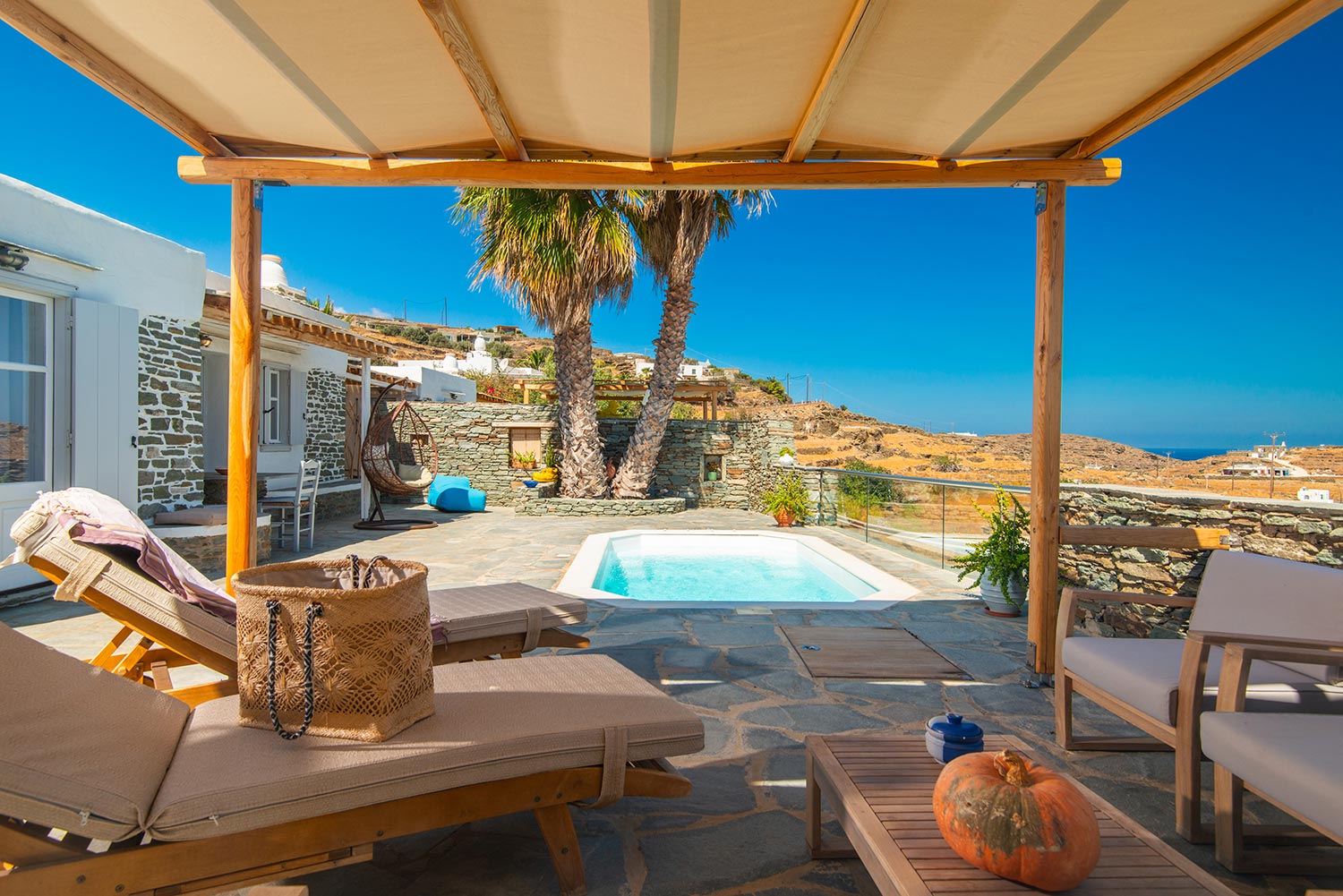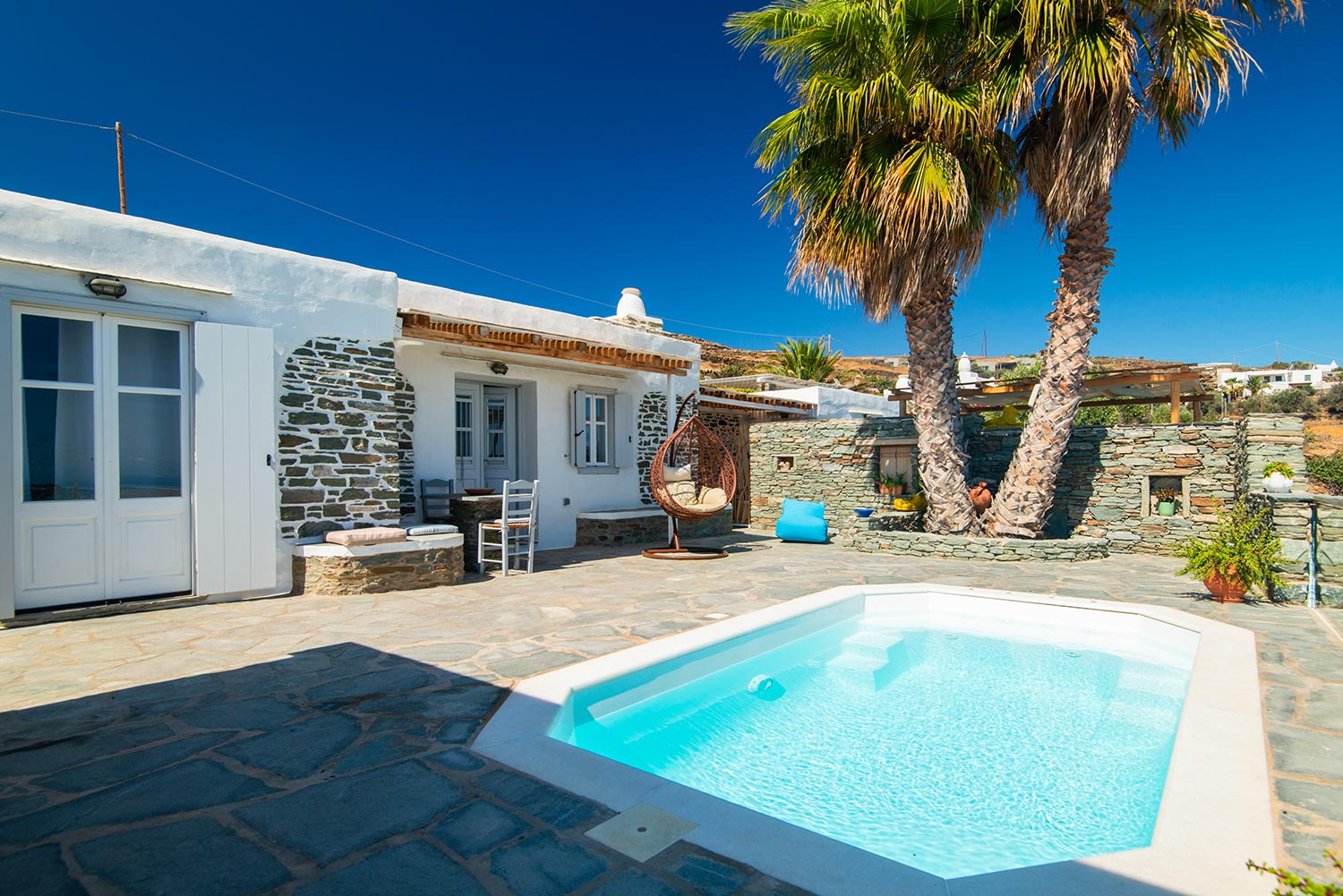Μια υπέροχη ευρύχωρη αυλή με μικρό καθιστικό και ιδιωτική πισίνα βρίσκεται μπροστά από κάθε διαμέρισμα, διαχωρισμένη από το διπλανό ώστε να εξασφαλίζεται η ιδιωτικότητα των φιλοξενούμενων. Η θέα είναι πραγματικά υπέροχη καθώς μπροστά απλώνεται η περιοχή του Φάρου με τις ξερολιθιές και τα ελαιόδεντρα και το καταγάλανο Αιγαίο.