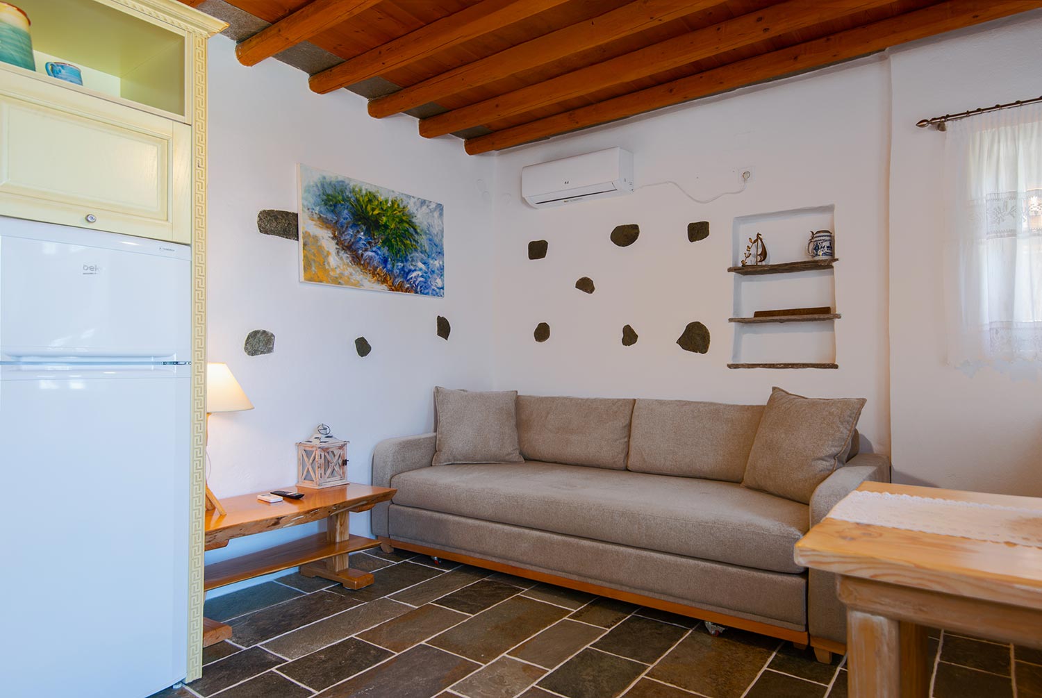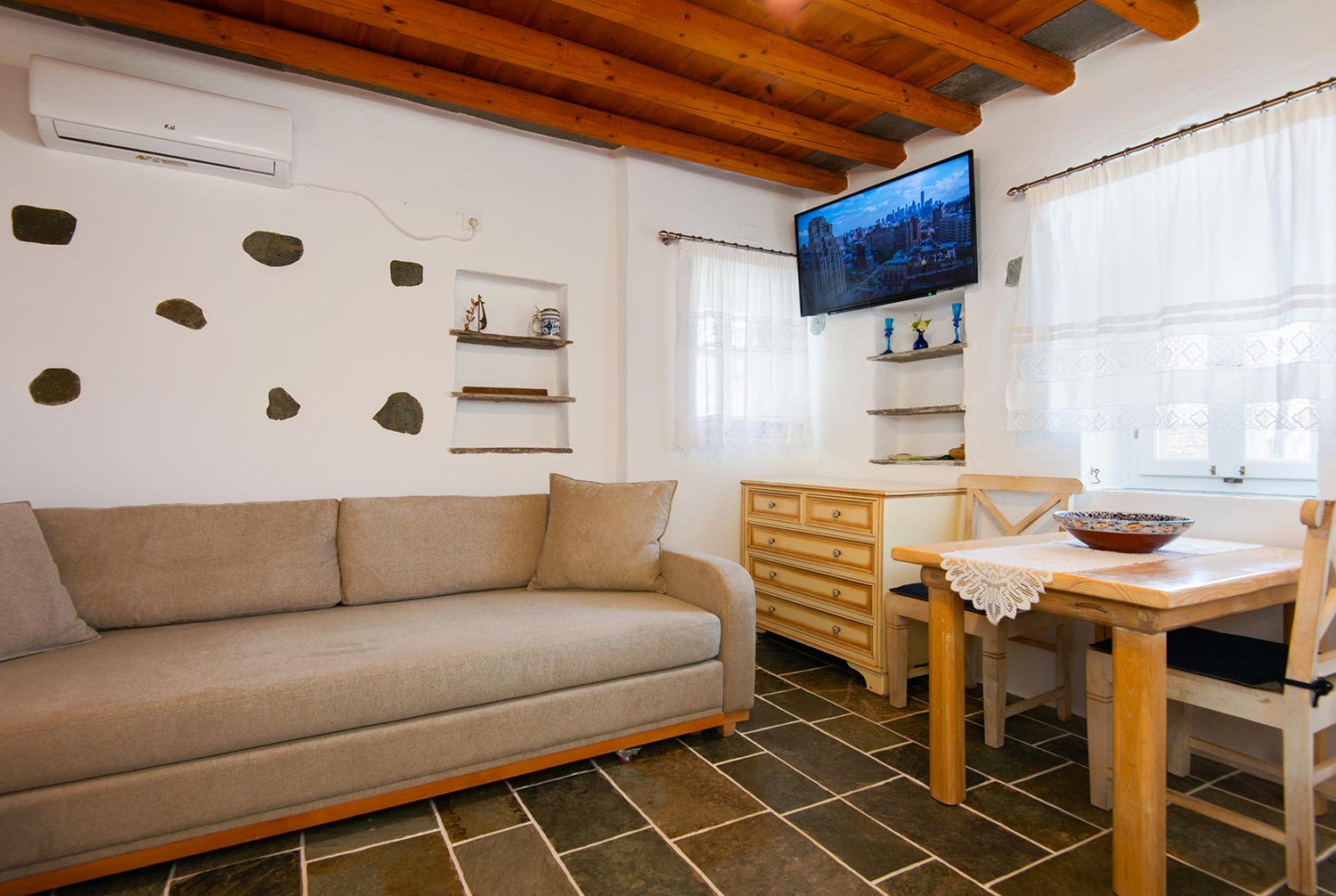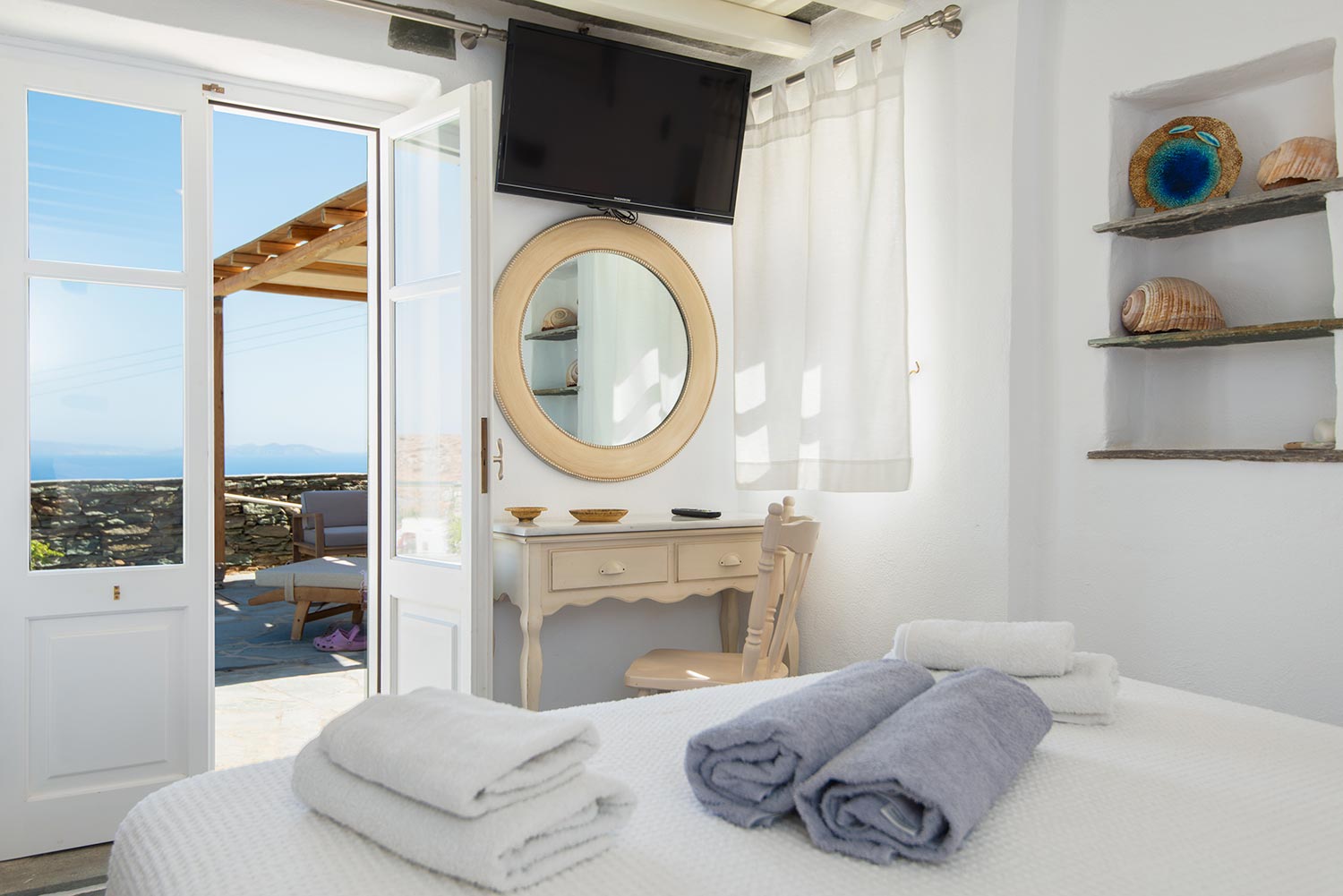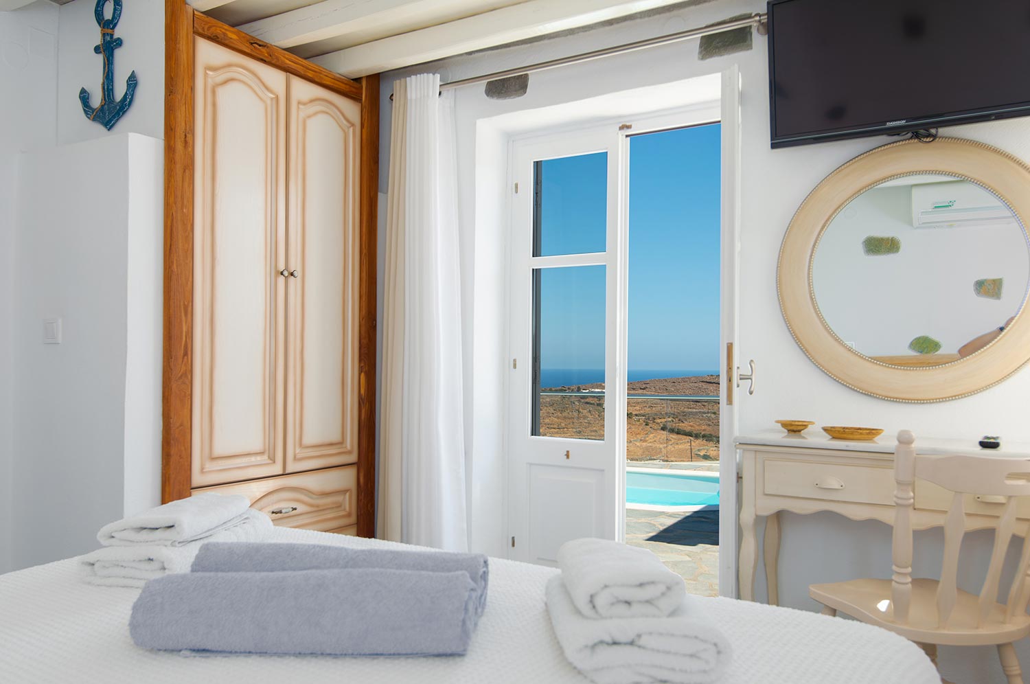 Μια υπέροχη ευρύχωρη αυλή με μικρό καθιστικό και ιδιωτική πισίνα βρίσκεται μπροστά από κάθε διαμέρισμα, διαχωρισμένη από το διπλανό ώστε να εξασφαλίζεται η ιδιωτικότητα των φιλοξενούμενων. Η θέα είναι πραγματικά υπέροχη καθώς μπροστά απλώνεται η περιοχή του Φάρου με τις ξερολιθιές και τα ελαιόδεντρα και το καταγάλανο Αιγαίο.