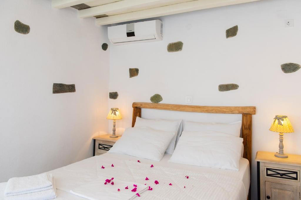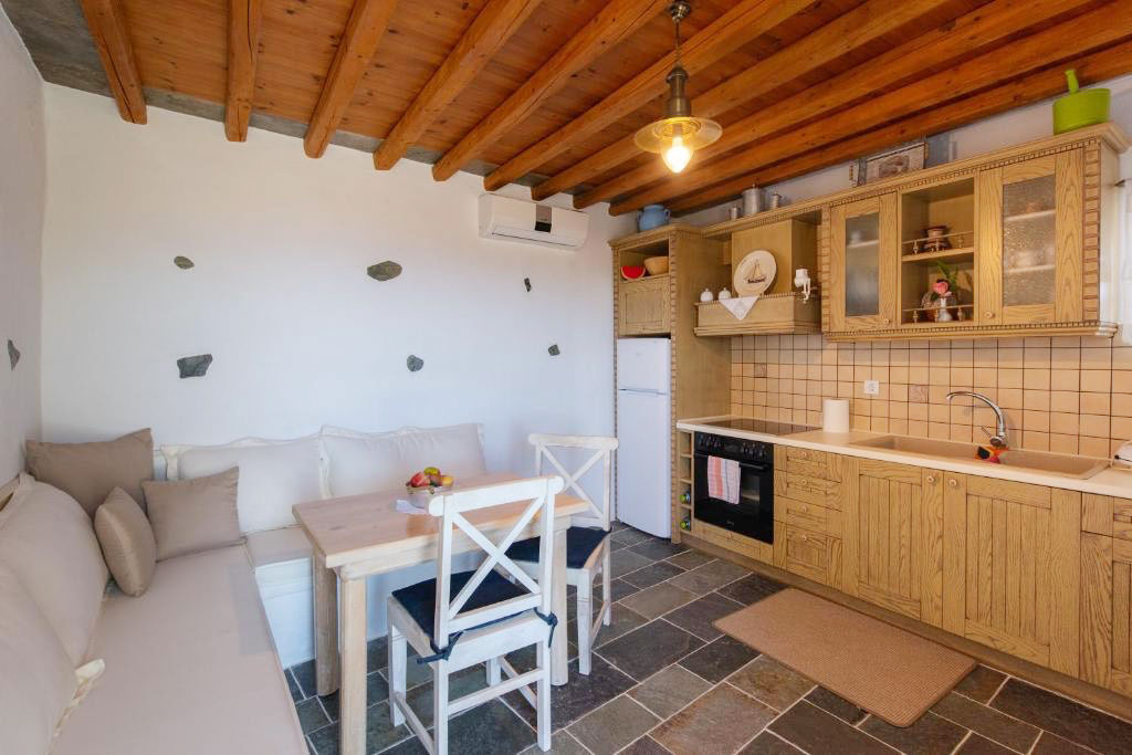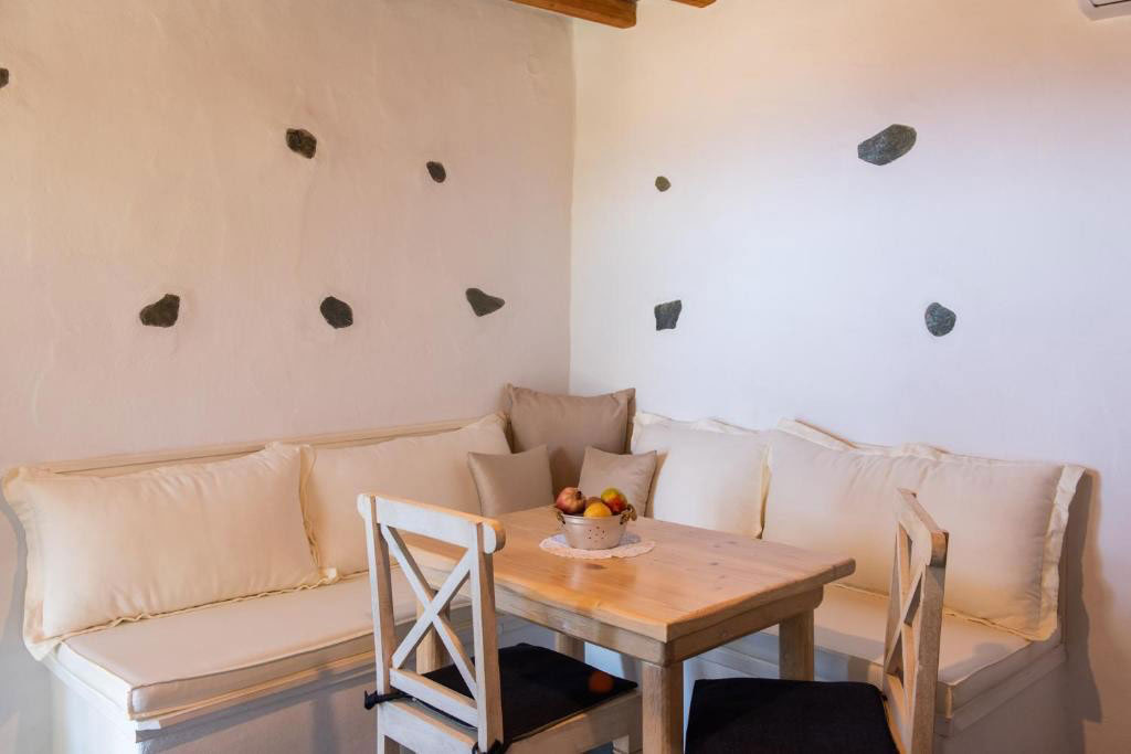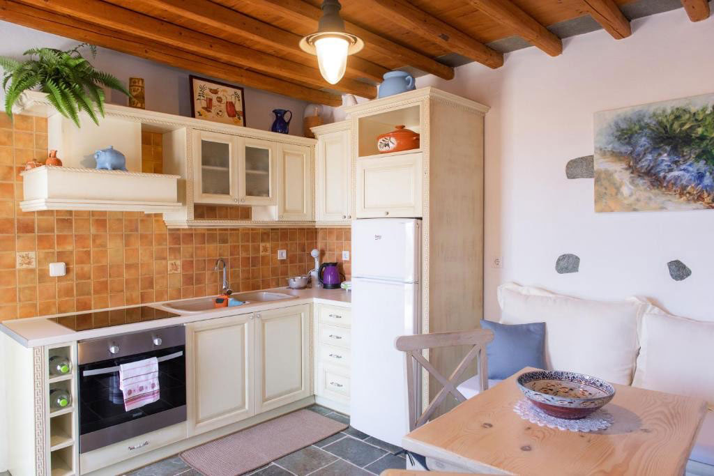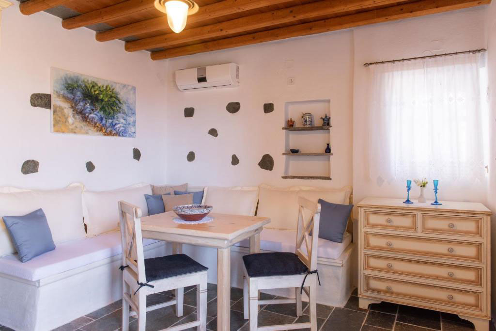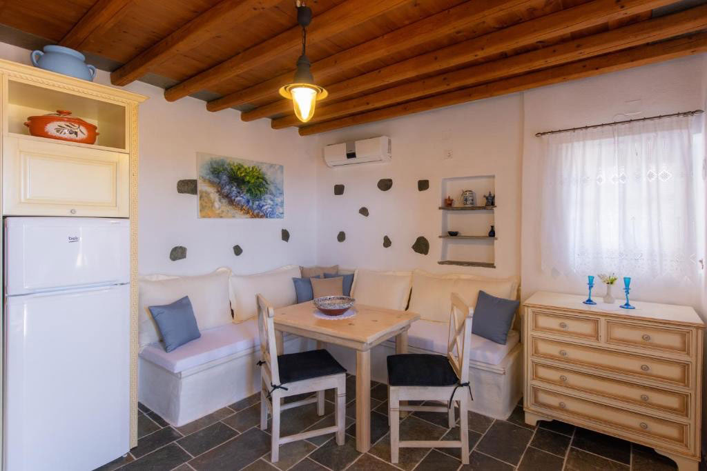 Les appartements Efthymia disposent de deux appartements de 40 m² chacun, portant les noms "Voukamvilia" et "Strofi". Ce sont/ Il s'agit de deux logements similaires, comprenant une chambre principale avec un lit double en maçonnerie et une autre pièce abritant la cuisine et le salon. Dans le salon, un canapé convertible peut se transformer en lit (simple ou double). À l'intérieur des appartements, le bois se mêle à la pierre, les teintes sont inspirées par la terre, et les éléments cycladiques complètent le cadre.