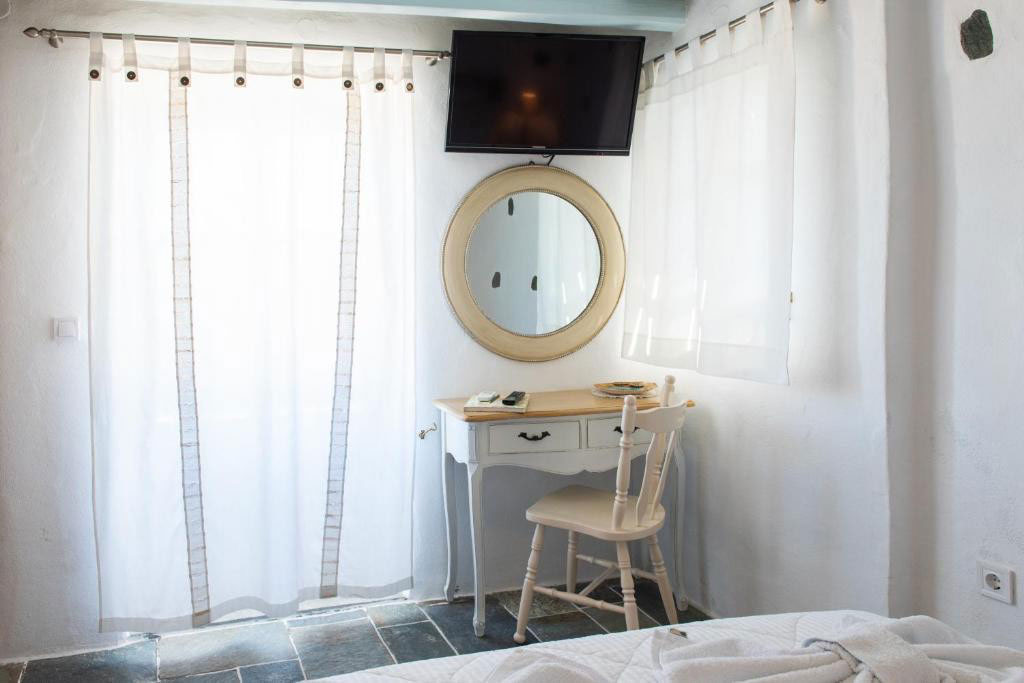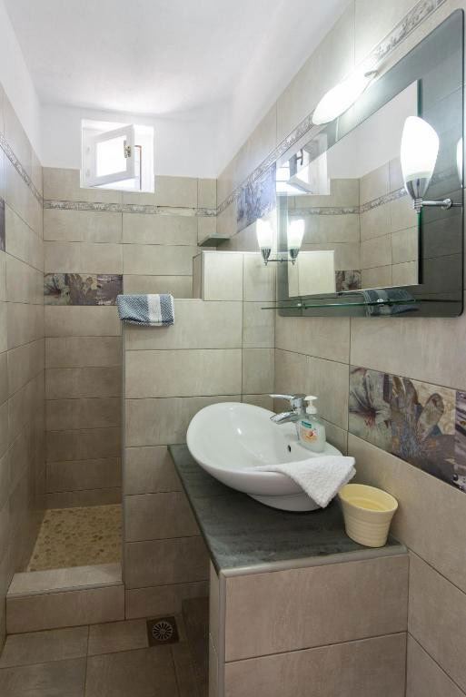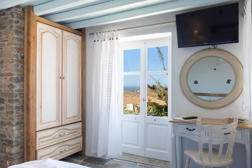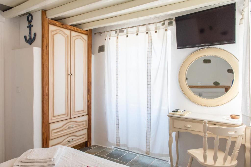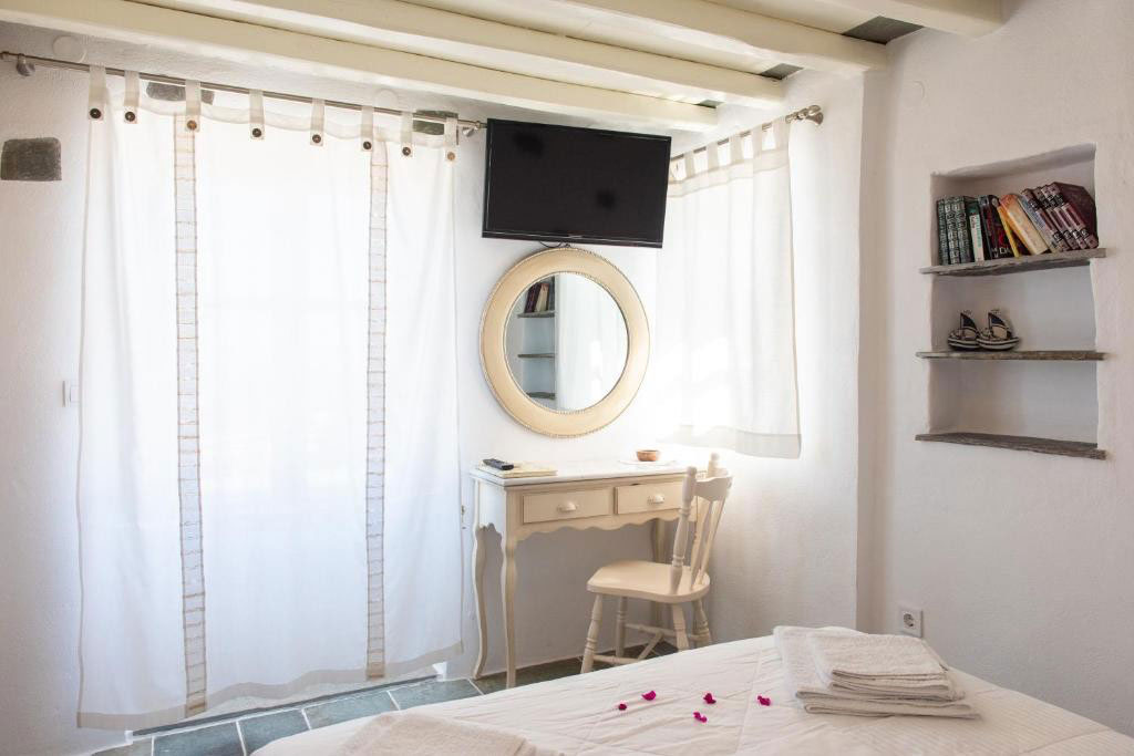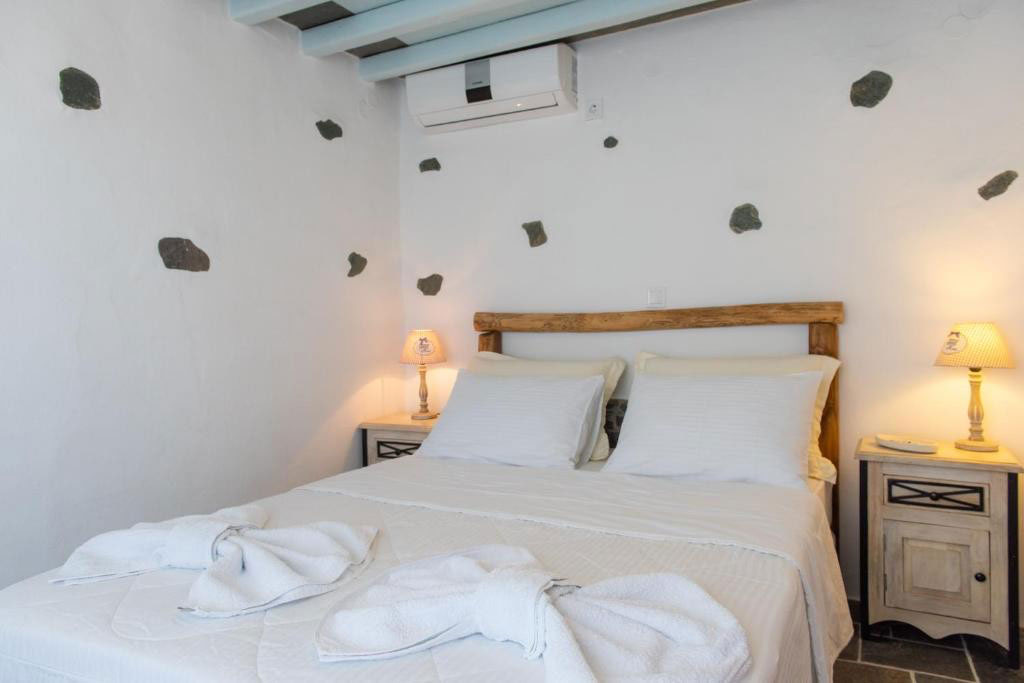 Les appartements Efthymia disposent de deux appartements de 40 m² chacun, portant les noms "Voukamvilia" et "Strofi". Ce sont/ Il s'agit de deux logements similaires, comprenant une chambre principale avec un lit double en maçonnerie et une autre pièce abritant la cuisine et le salon. Dans le salon, un canapé convertible peut se transformer en lit (simple ou double). À l'intérieur des appartements, le bois se mêle à la pierre, les teintes sont inspirées par la terre, et les éléments cycladiques complètent le cadre.