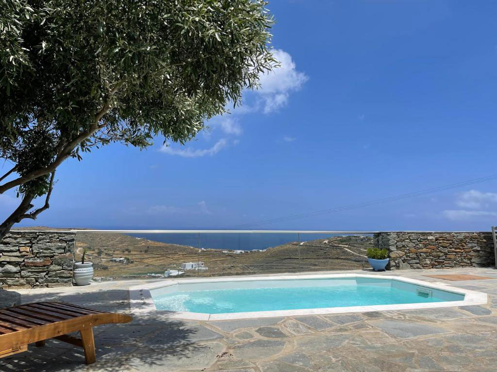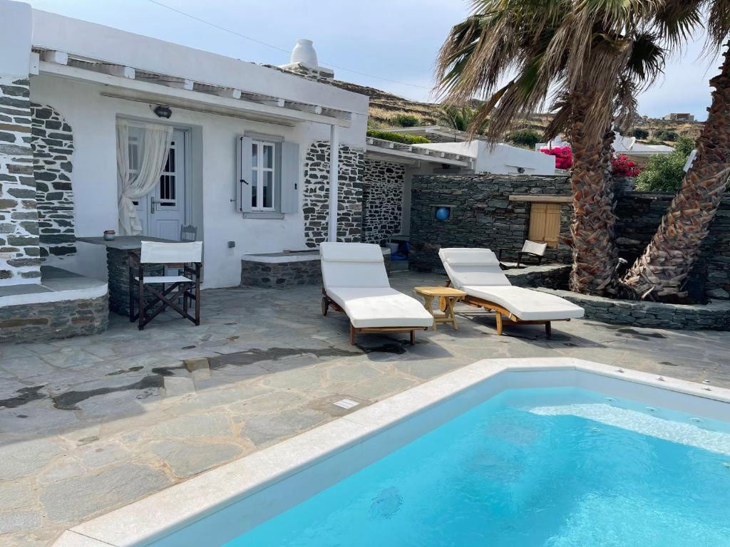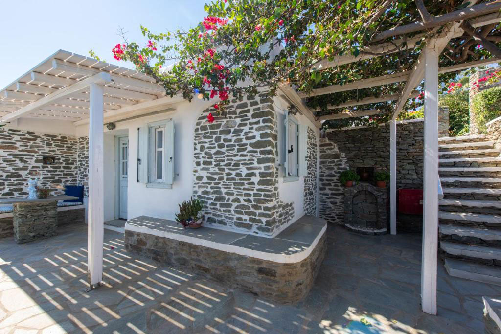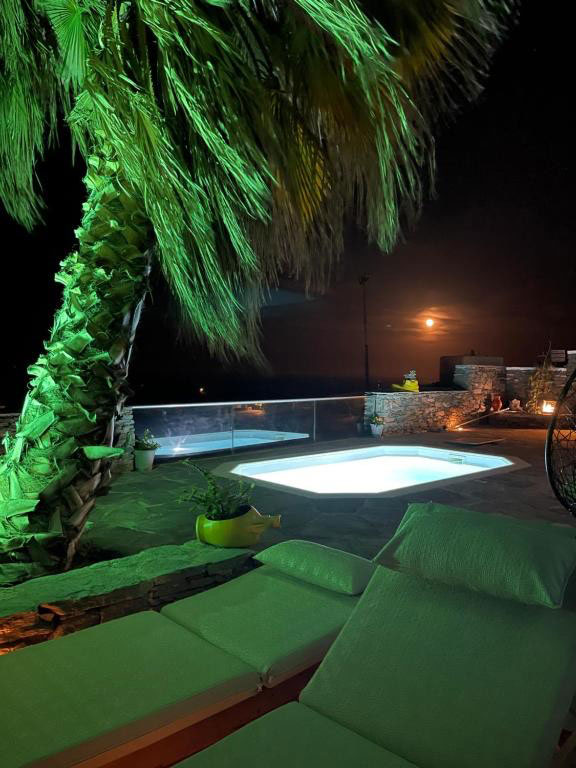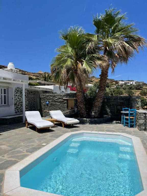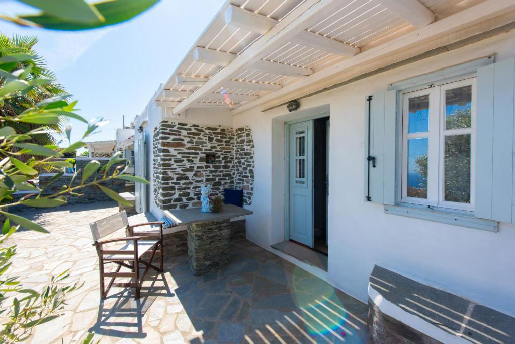 Une merveilleuse cour spacieuse avec un petit coin salon et une piscine privée se trouve devant chaque appartement, séparée du voisin afin d'assurer l'intimité des résidents. La vue est vraiment magnifique, car devant s'étend la région de Faros avec ses rochers arides, les oliviers et la mer Égée azur.